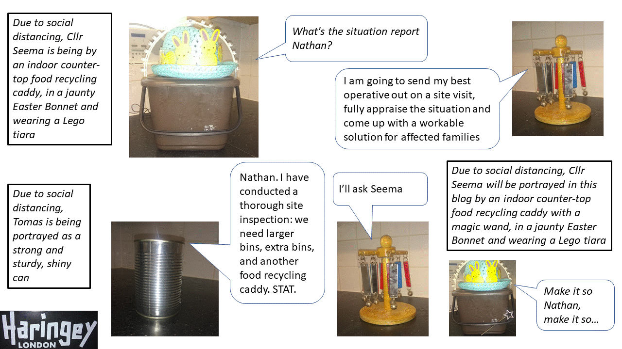 In lockdown, we've been generating more waste arising from our sons disability, so Cllr Seema, Veolia and Haringey helped us out with some 'grey' extra bins. They also helped lots of other families near where we live. But, we've not been out for a while, so this is how that all got distorted in my warped mind...